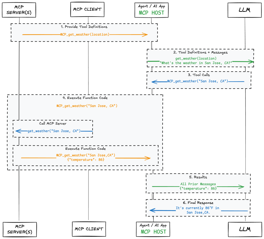 - 大模型生成调用指令(如“调用MCP_get_weather,参数San Jose, CA”)