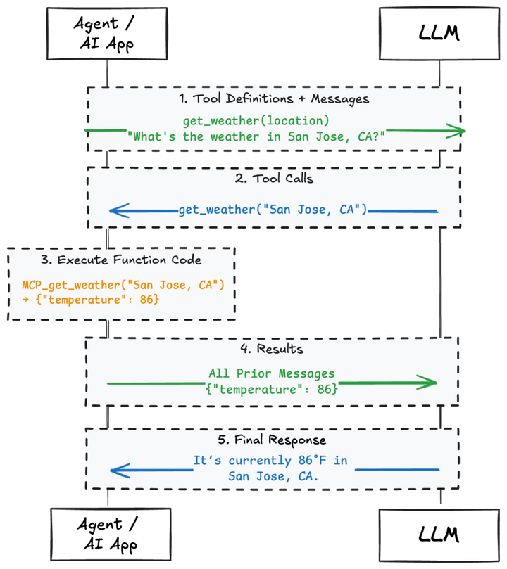 - 大模型生成工具调用指令(如“调用get_weather,参数San Jose, CA”)