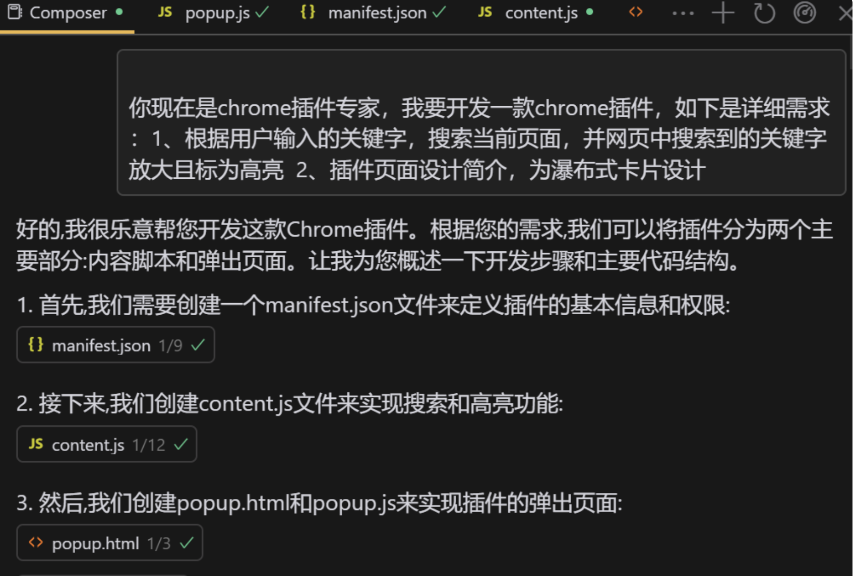 Composer的魔法:使用command加i调出composer开始项目,将之前预写的需求输入composoer,这是一个快速进入开发状态的捷径。