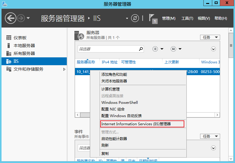 - 在服务器管理器的左侧导航栏中,单击 IIS。