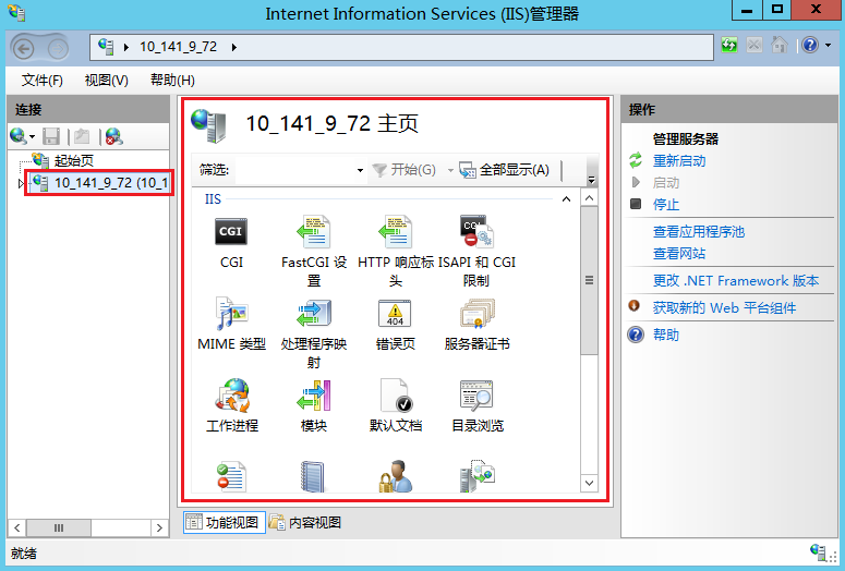 - 在打开的 “Internet Information Sevices (IIS)管理器” 窗口中,单击左侧导航栏的服务器名称,进入服务器的主页。如下图所示: 例如,单击 10_141_9_72 服务器名称,进入 10_141_9_72 主页。