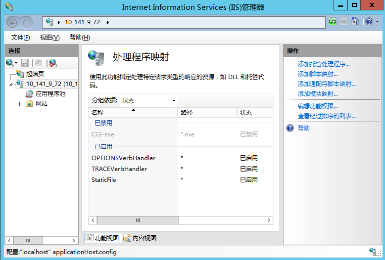 - 在10_141_9_72 主页中,双击处理程序映射,进入 “处理程序映射” 管理界面。如下图所示: