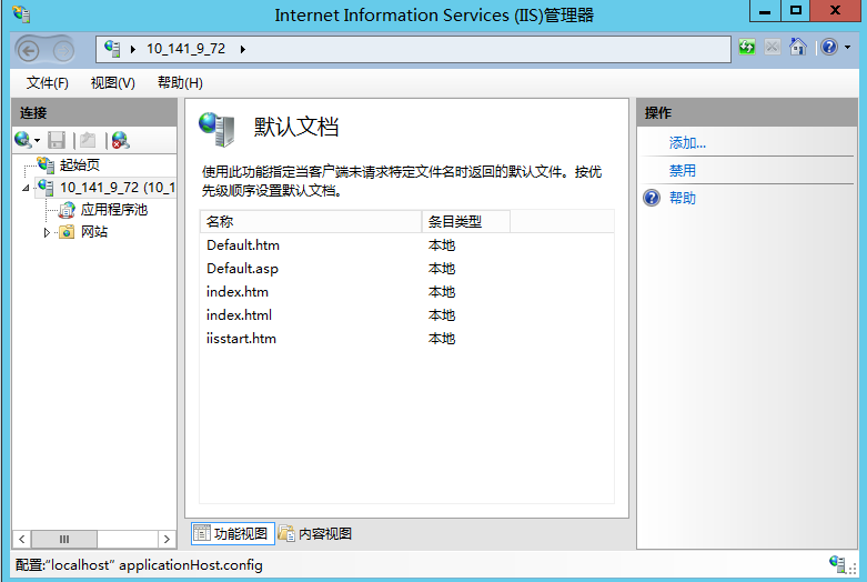 - 在10_141_9_72 主页中,双击默认文档,进入 默认文档 管理界面。如下图所示: