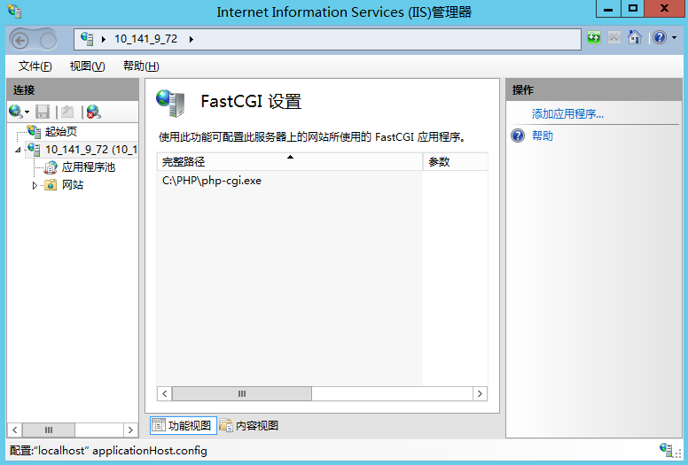 - 在10_141_9_72 主页中,双击 FastCGI 设置,进入 FastCGI 设置管理界面。如下图所示: