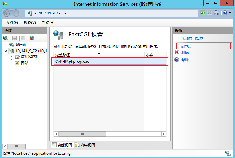- 在 FastCGI 设置管理界面,选择 FastCGI 应用程序,单击编辑。如下图所示:
