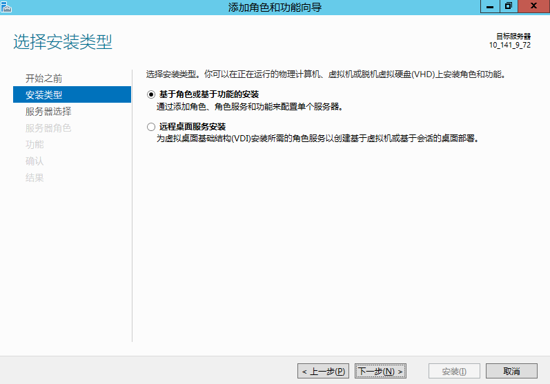 5. 在选择安装类型界面,选择基于角色或基于功能的安装,并连续单击2次下一步。如下图所示: