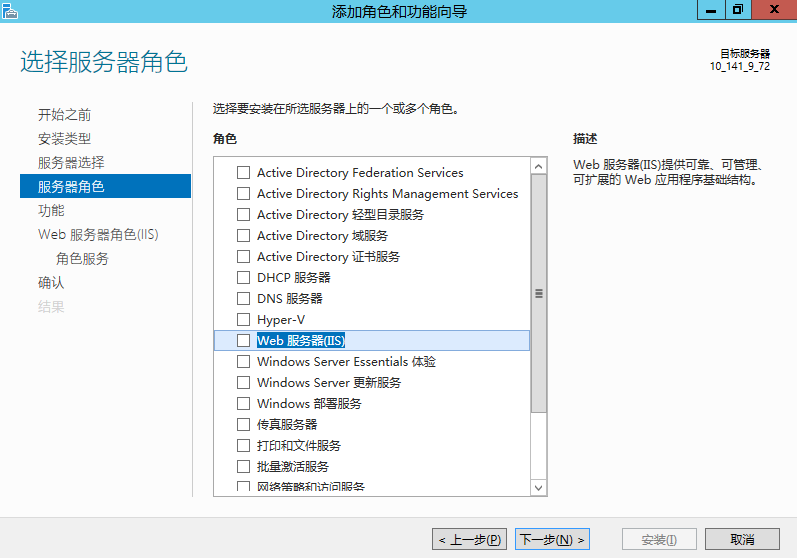 5. 在选择服务器角色界面,勾选 Web 服务器(IIS),并连续单击2次下一步。如下图所示:
