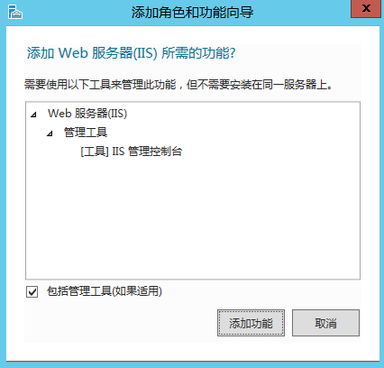 7. 在弹出的添加 Web 服务器(IIS)所需的功能提示框中,单击添加功能。如下图所示: