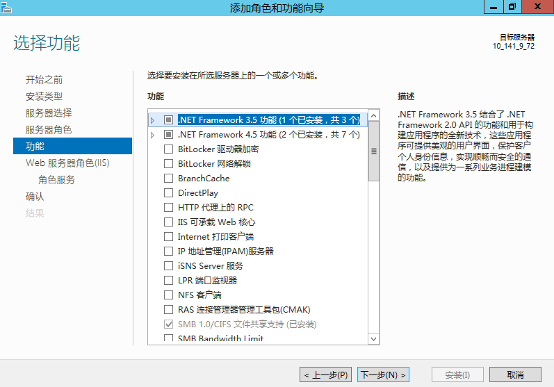 9. 在选择功能界面,勾选 .NET Framework 3.5 功能,并连续单击2次下一步。如下图所示:
