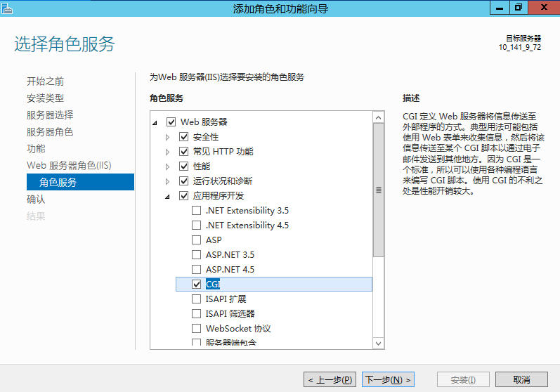 10. 在选择角色服务界面,勾选 CGI,单击下一步。如下图所示: