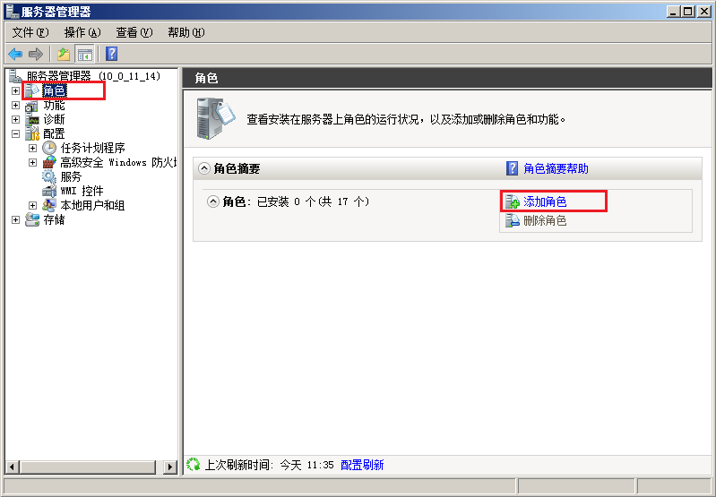 3. 在左侧导航栏中,选择角色,并在右侧窗口中单击添加角色。如下图所示: