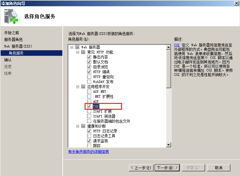 6. 在选择角色服务界面,勾选 CGI,单击下一步。如下图所示:
