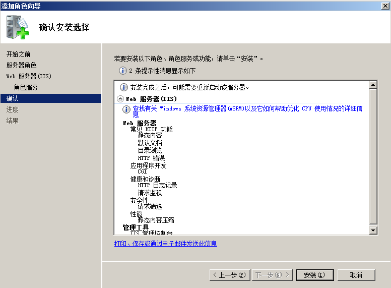 6. 在选择服务器角色界面,勾选 Web 服务器(IIS)。如下图所示: 弹出添加 Web 服务器(IIS)所需的功能提示框。