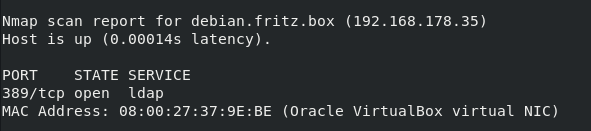 如您所见,据说该虚拟机上的端口389已打开,表明其中正在OpenLDAP服务器。