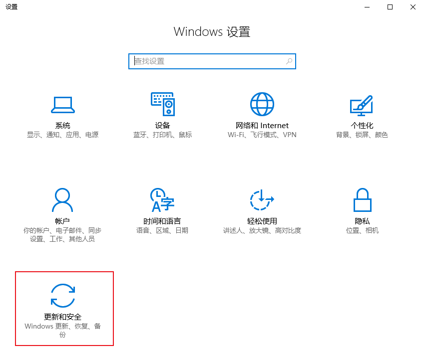 2. 在打开的设置窗口中,选择更新和安全。如下图所示: