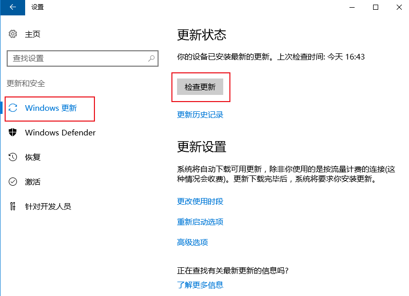 3. 在更新和安全中,选择 Windows 更新,单击检查更新。如下图所示: