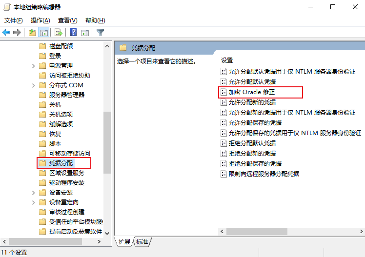 2. 在左侧导航栏中,选择计算机配置 > 管理模板 > 系统 > 凭据分配,双击加密 Oracle 数据库修正。如下图所示:
