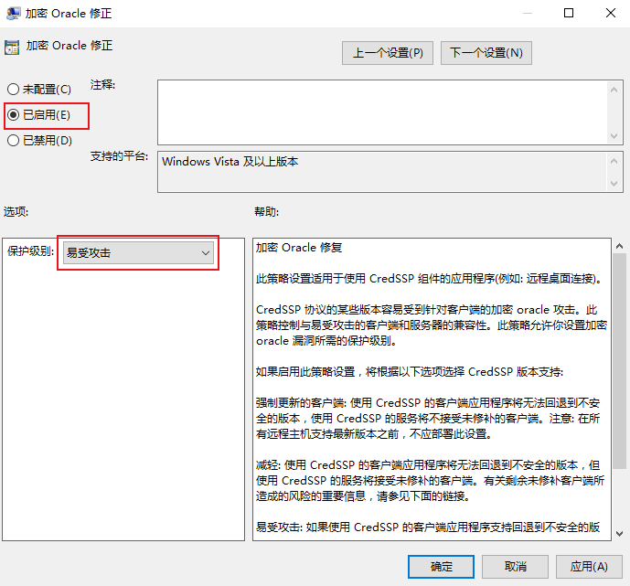 3. 在打开的加密 Oracle 修正窗口中,选择已启用,并将保护级别设置为易受攻击。如下图所示: