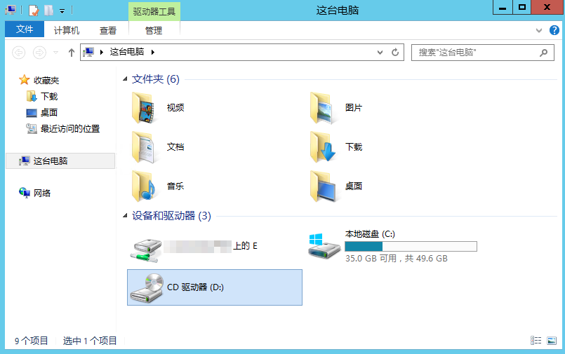 11. 在操作系统界面,单击 ,选择这台电脑,检查设备和驱动器中是否加载了 CD-驱动器。如下图所示: