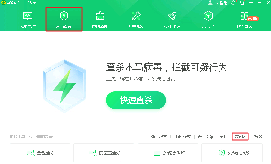 1. 打开360安全卫士,选择木马查杀 > 恢复区。如下图所示: