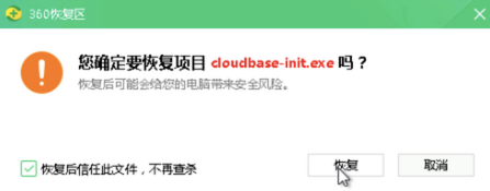 3. 在弹出的确定窗口中,勾选恢复后信任此文件,不再查杀,并单击恢复即可。如下图所示: