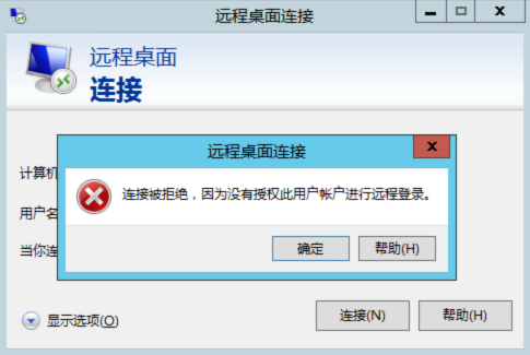 :Windows 使用远程桌面连接 Windows 实例时,提示连接被拒绝,因为没有授权此用户账户进行远程登录。如下图所示: