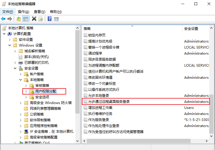 2. 在左侧导航树中,选择计算机配置 > Windows 设置 > 安全设置 > 本地策略 > 用户权限分配,双击打开允许通过远程桌面服务登录。如下图所示:
