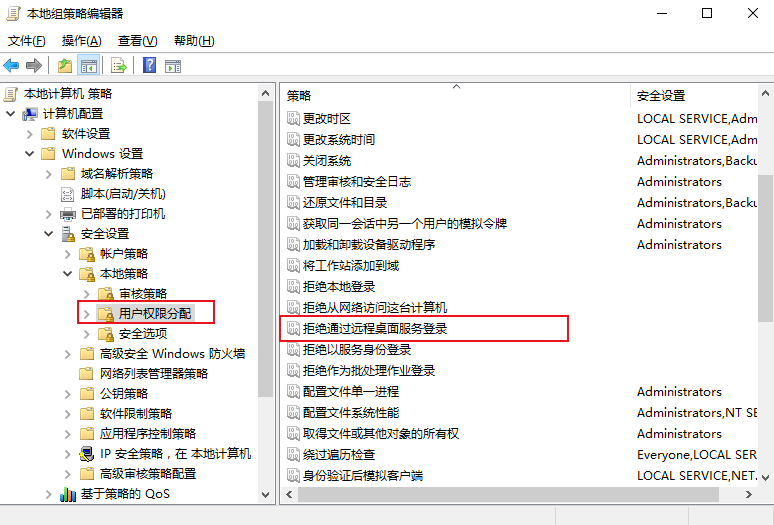 2. 在左侧导航树中,选择计算机配置 > Windows 设置 > 安全设置 > 本地策略 > 用户权限分配,双击打开拒绝通过远程桌面服务登录。如下图所示: