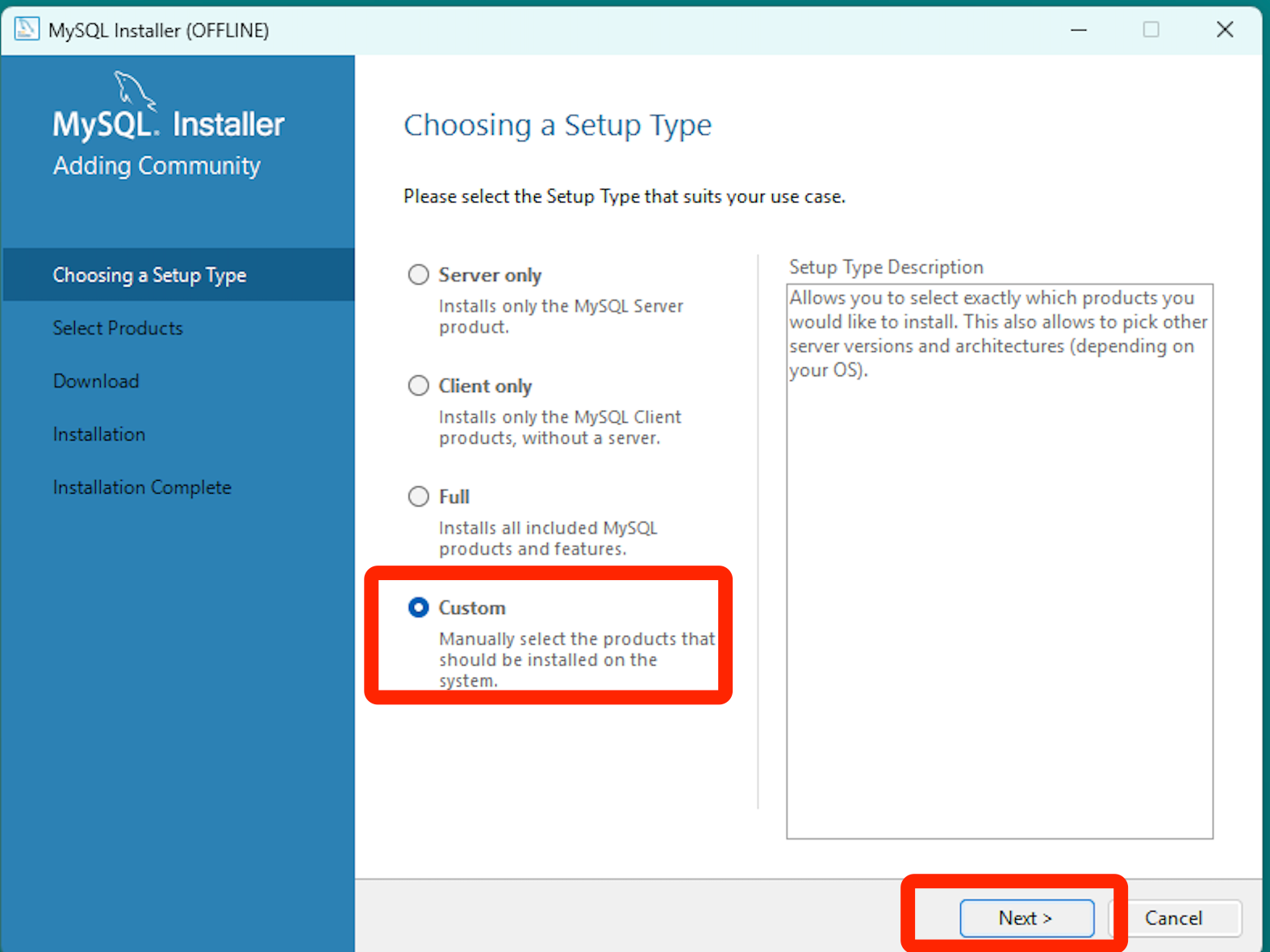 建议选择 “Custom” 自定义安装,这样可以根据实际需求选择安装组件,点击 “Next”。