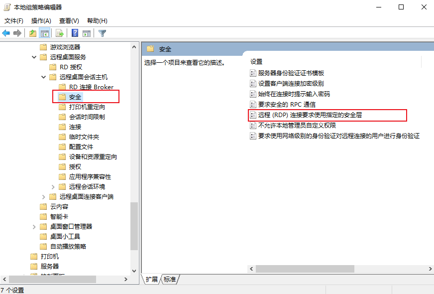 2. 在左侧导航树中,选择计算机配置 > 管理模板 > Windows 组件 > 远程桌面服务 > 远程桌面会话主机 > 安全,双击远程(RDP)连接要求使用指定的安全层。如下图所示: