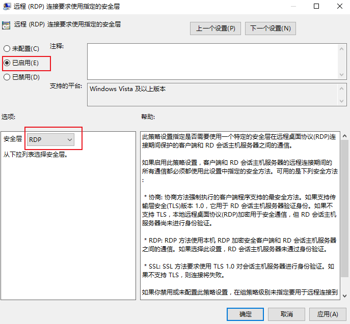 3. 在打开的远程(RDP)连接要求使用指定的安全层窗口中,选择已启用,并将安全层设置为 RDP。如下图所示: