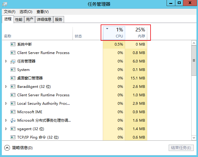 2. 在打开的任务管理器中,即可查看资源占用情况。如下图所示: