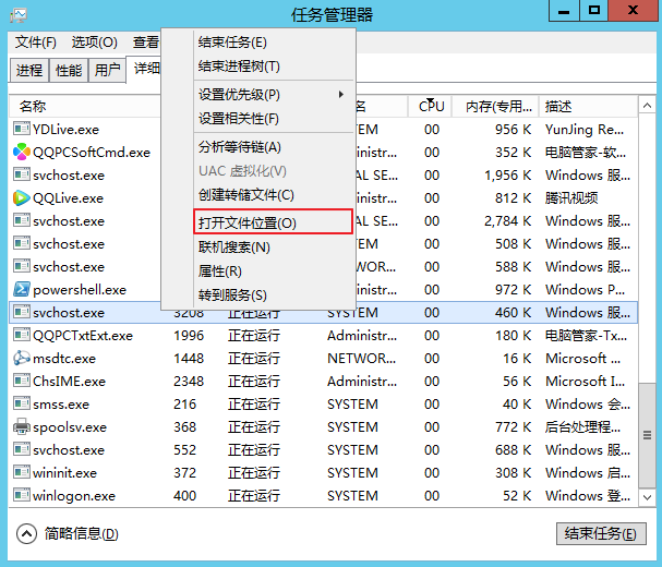 目录下,并且会有完善的签名和介绍。您可以在任务管理器中,右键单击待查看的进程,选择打开文件位置,即可查看具体可执行文件的位置。例如 svchost.exe