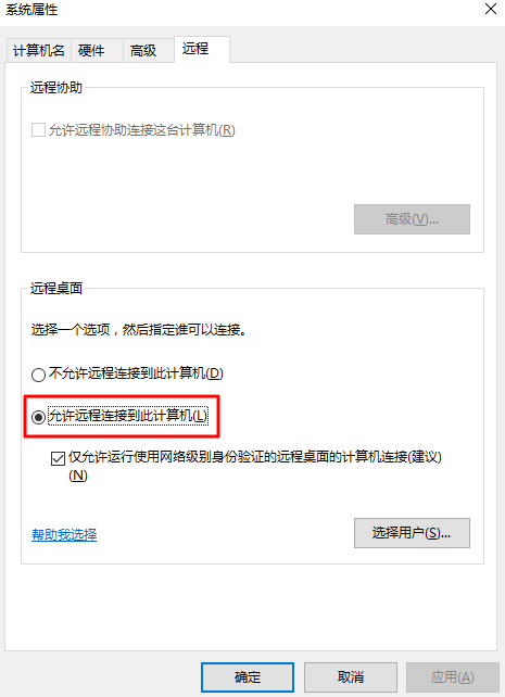 未勾选允许远程连接到此计算机,请勾选并单击确定