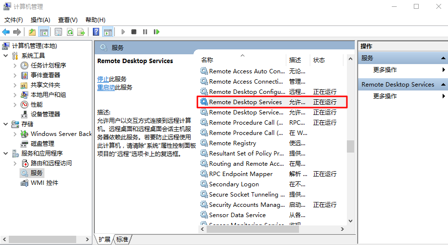 7. 在右侧的服务列表中,检查 Remote Desktop Services 是否启动。如下图所示:
