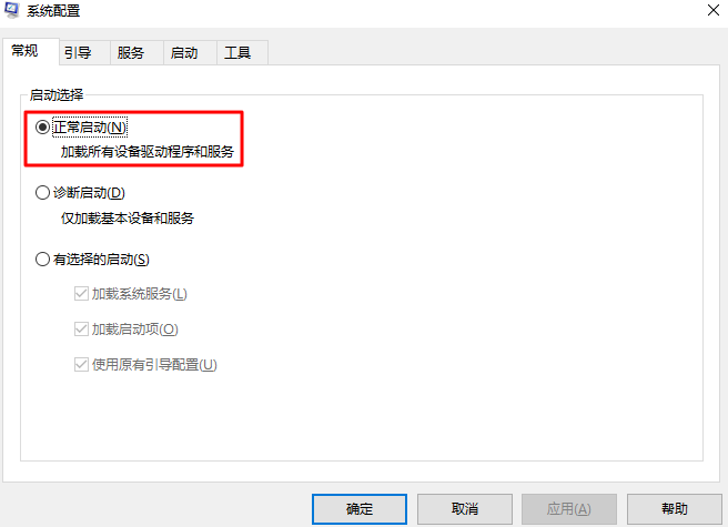 10. 在打开的系统配置窗口中,检查是否勾选正常启动。如下图所示: