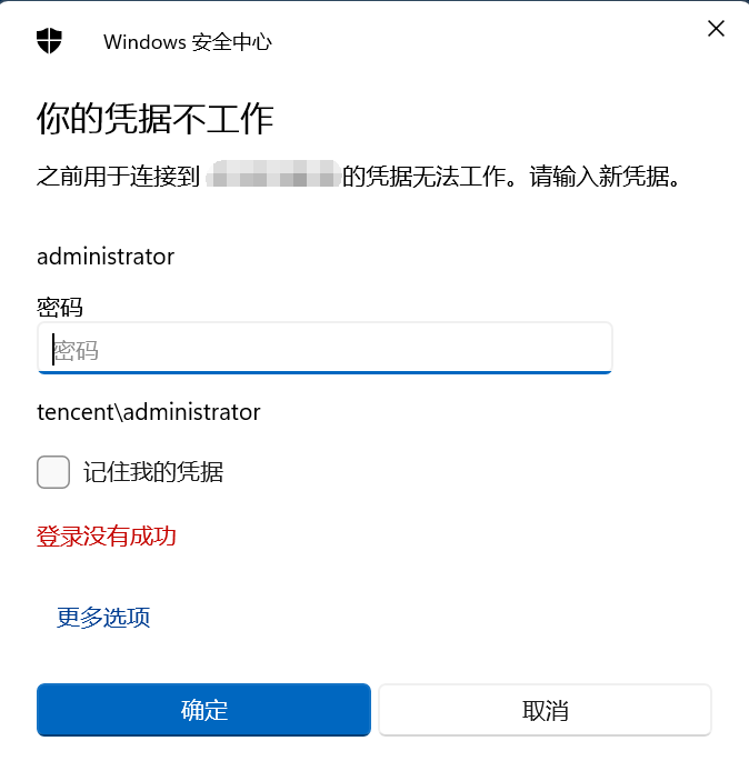 如果输入新凭据,仍提示凭据不工作,请同时检查您的用户名是否拼写正确(Windows系统默认用户名为 Administrator)。