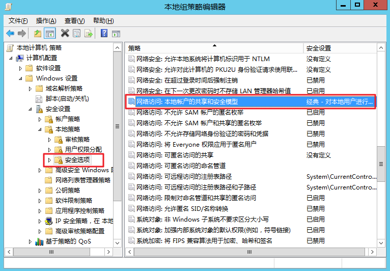 5. 找到并打开安全选项中的网络访问:本地账户的共享和安全模型。如下图所示: