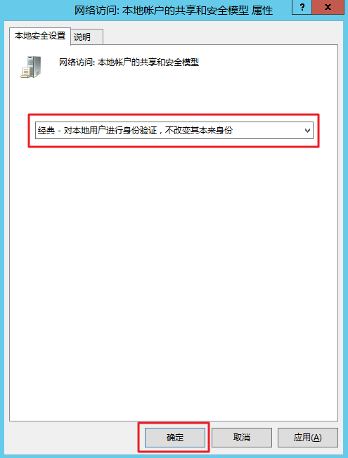 6. 选择经典 - 对本地用户进行身份验证,不改变其本来身份,单击确定。如下图所示: