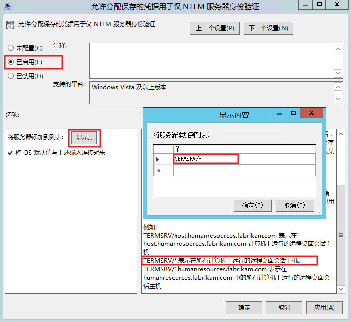 3. 在打开的窗口中,选择已启用,并在选项的显示中输入TERMSRV/*