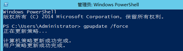 6. 在 Windows PowerShell 窗口中,输入 gpupdate /force,按 Enter,更新组策略。如下图所示:
