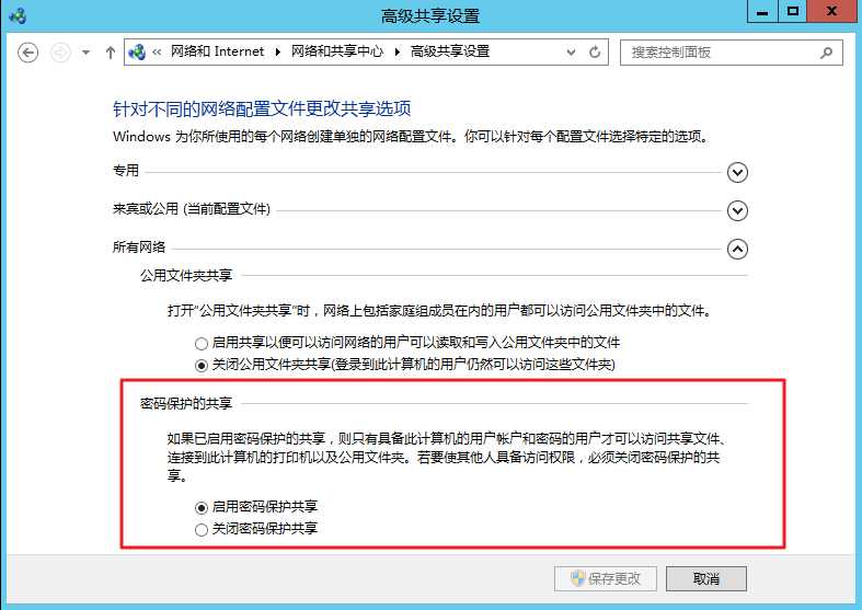 2. 展开所有网络页签,并在密码保护的共享下选择关闭密码保护共享,单击保存更改。