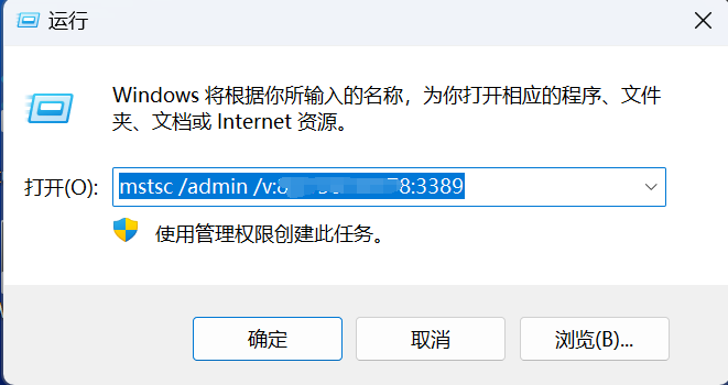 可在运行窗口或命令提示符窗口中输入命令:mstsc /admin /v:云服务器IP地址:远程端口号,登录云服务器。