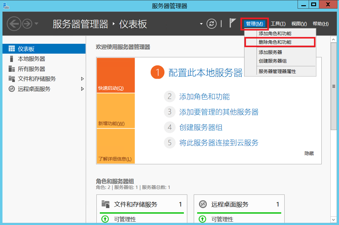 2. 单击服务器管理器右上方的管理,选择删除角色和功能。如下图所示: