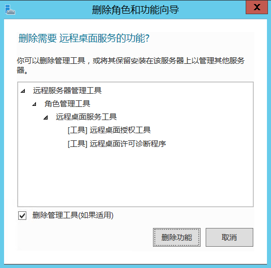 4. 在删除服务器角色界面,取消勾选远程桌面服务,并在弹出的提示框中,选择删除功能。如下图所示: