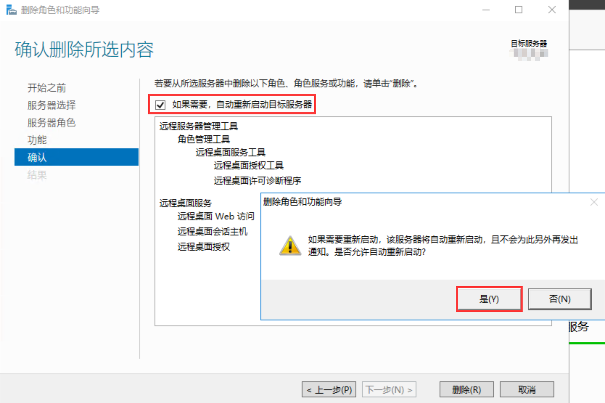 6. 勾选如果需要,自动重新启动目标服务器,并在弹出的提示框中单击是。如下图所示:
