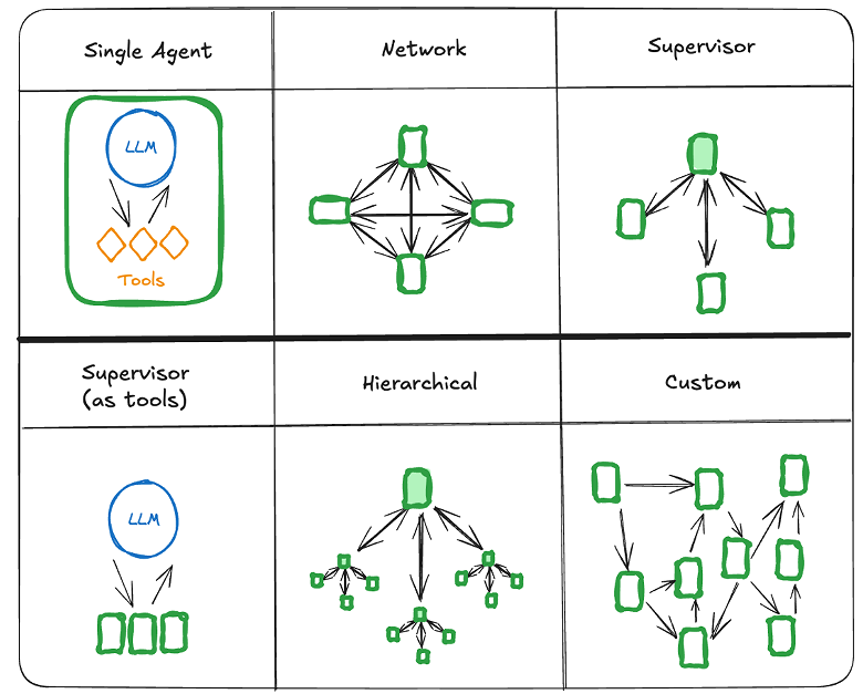 LangGraph是LangChain的扩展,专门用于构建有状态的多步骤工作流(图)。它支持多种多智能体架构模式: