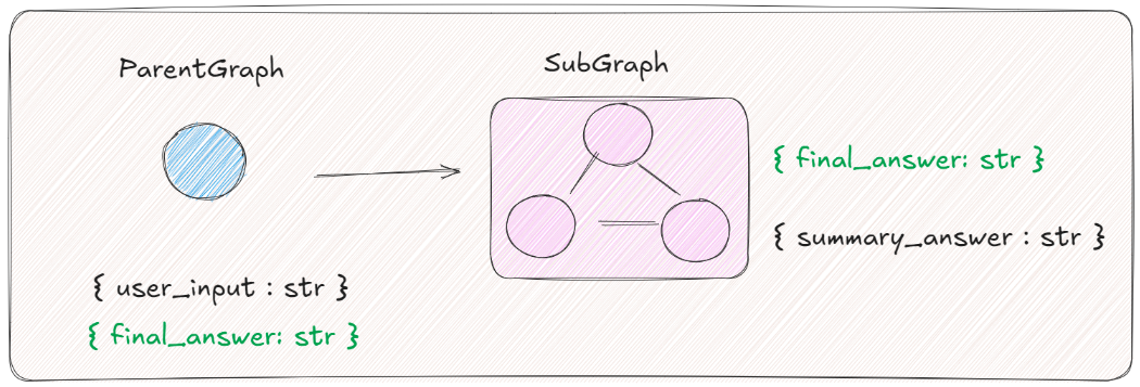 - 定义状态:父图状态(ParentState)和子图状态(SubgraphState)通过final_answer键共享数据。