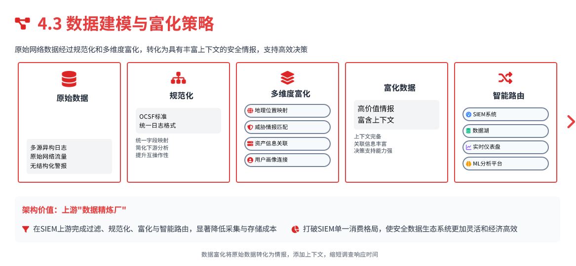 数据富化将原始数据转化为情报。通过在数据流中实时添加上下文,分析引擎能够做出更准确的判断,分析师在收到警报时也能立即获得所需的所有背景信息,从而显著缩短调查响应时间。