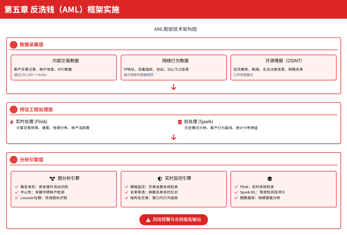 一个成熟的AML平台必须采用一种混合策略,它结合了实时规则、机器学习和深度图分析,没有任何单一技术能够独立应对所有挑战。监管机构要求金融机构执行明确的规则检查,Flink的低延迟流处理是实现这些高容量、简单规则检查的理想工具。然而,犯罪分子深知这些规则,并会采用"结构化"和"分层"等手段来规避它们。为了检测这些更隐蔽的行为,需要利用Spark在海量历史数据上训练机器学习模型,以识别与正常行为模式的细微偏差。而对于最高级的、涉及协同网络的有组织犯罪,只有通过图分析技术才能揭示实体间的深层联系。因此,一个强大的AML系统必须将这三者有机结合:Flink用于实时合规检查,Spark ML用于预测性风险评分,而Spark GraphFrames或专用图数据库则用于进行网络分析。这三者的输出相互补充,形成了一个多层次、纵深化的防御体系。